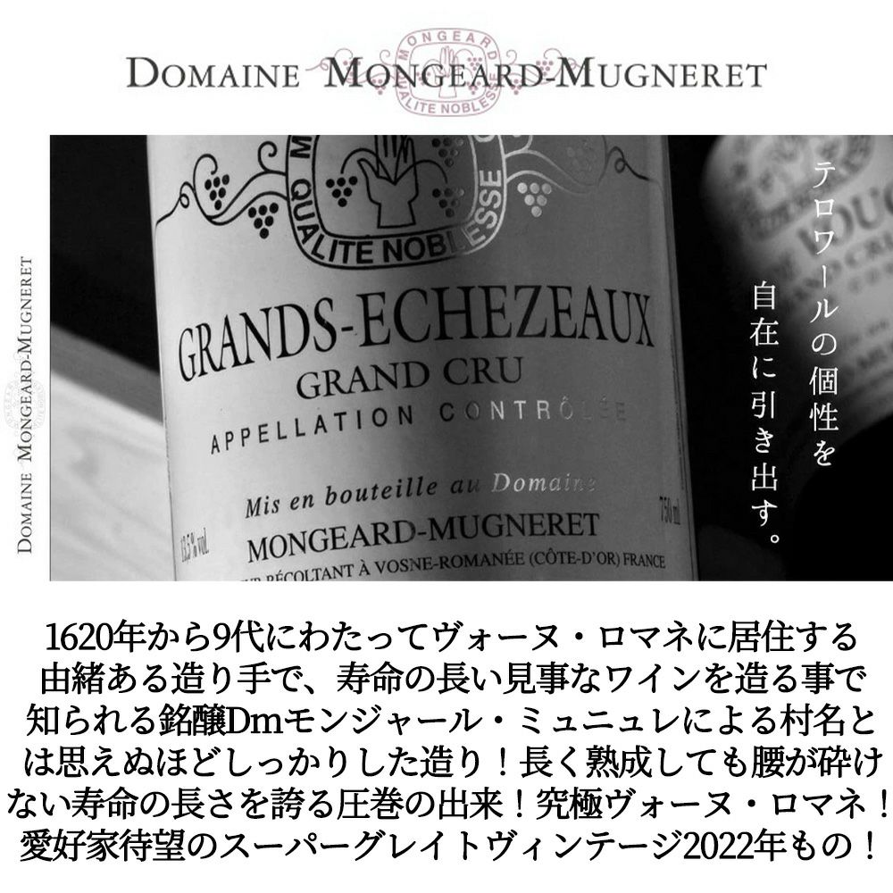 他の画像を見る エシェゾー グラン クリュ 特級 2022 蔵出し 手摘み100% ドメーヌ モンジャール ミュニュレ元詰 AOCエシェゾー グラン クリュEchezeaux Grand Cru 2022 Domaine Mongeard Mugneret 赤ワイン フランス フルボディ 辛口 当店特別価格 ¥ 50,160 税込 カートに入れる お気に入りに登録する