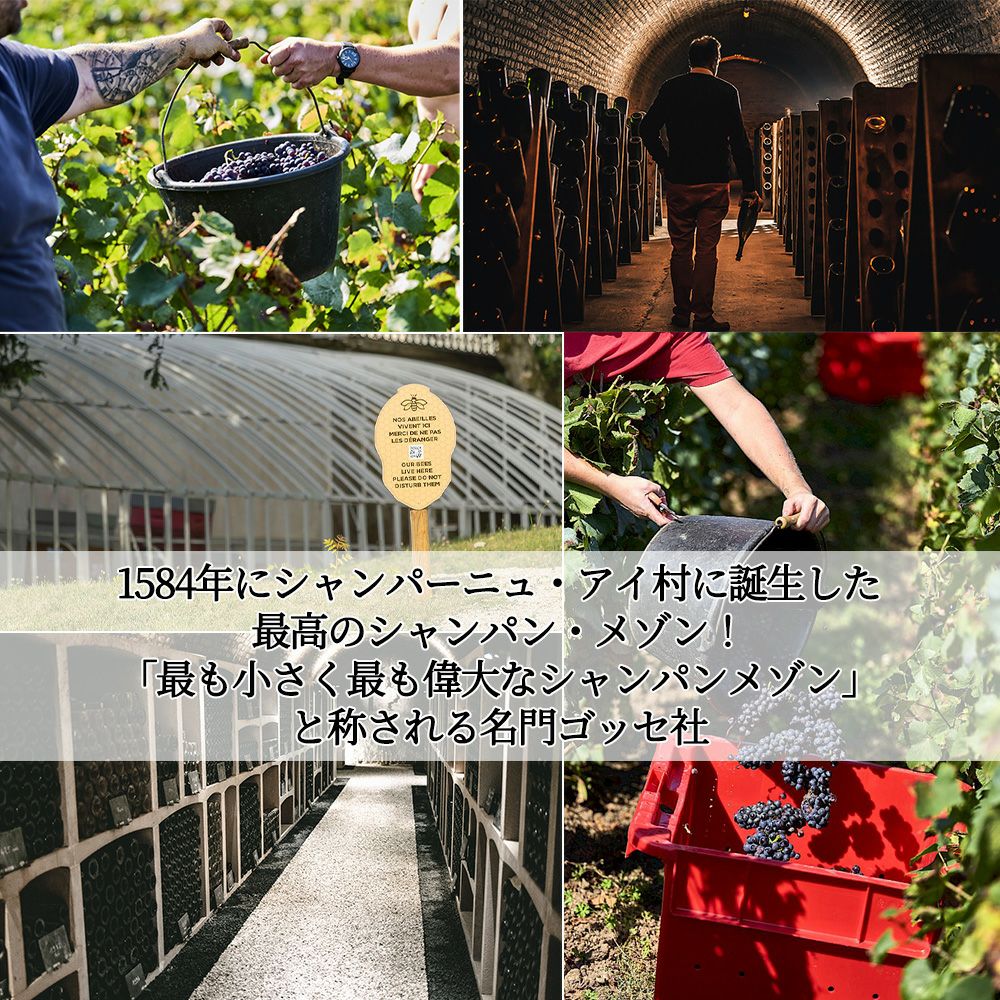 大人気!シャンパーニュ愛好家垂涎!1584年にシャンパーニュ・アイ村に誕生した最高のシャンパン・メゾンで「最も小さく最も偉大なシャンパンメゾン」と称される名門ゴッセ社によるハウスの代表作!“グラン・レゼルヴ”!2024年で、なんと440周年!それを記念して、数量限定で特別デザインボトルで登場!ゴッセ社といえば2013年末のラ・レヴュー・デュ・ヴァン・デ・フランス誌のシャンパーニュ・メゾン特集(ブラインドテイスティング)でドンペリやクリュッグを抑え、高評価を受け、又2013年にはフランス政府からフランスの文化と歴史を継承する有形遺産に指定(これはゴッセとボランジェのみ)!!440年の歴史を誇るゴッセにあって、規模を拡大させることなく質を重視する「最小かつ最良のメゾン」として愛好家から絶大な支持を受ける人気シャンパーニュ!いかにもワインらしい強い風味のあるスタイルのシャンパンとして有名!そのマロラクティック発酵を行わない、フレッシュで活き活きとした酸が最大の特徴であり、その酸を馴染ませるために最低でも36ヶ月、長いもので120ヶ月の熟成期間をとりバランスをとるというポリシーを貫く!このグラン・レゼルヴは、アンボネイ村やアヴィーズ村等グラン・クリュの葡萄主体で、ピノ・ノワール45%、シャルドネ45%、ピノ・ムニエ10%、しかもリザーヴワインをなんと30~35%使用!しかもヴィンテージは3つのヴィンテージと使用した長熟のヴィンテージのみ使用の長熟シャンパーニュ!もちろんマロ発酵なし、しかもデゴルジュ前に平均驚異の60ヶ月以上の熟成でリリース(一般的なシャンパーニュは15ヶ月以上)!ドサージュ8g/Lの本格派!というハウスの代表作!このグラン・レゼルヴでワインアドヴォケイト誌で驚異の92点でコメントは「果樹園の果実、洋ナシ、アプリコットのアロマに、焼きたてのパンやお菓子のヒントが混ざり合った、ゴッセの最新リリース、NVブリュット・グランド・レゼルヴを紹介しよう。ミディアムからフルボディで、肉付きがよく、しかし鋭いワイン。ゴッセの現在のシャンパーニュ・シリーズは素晴らしい。」!ル・ギィド・ラローズ・シャンパーニュで高評価獲得!Tyson Stelzerのシャンパーニュでも絶賛!ベタンヌ&ドゥソーヴでも高評価!Richard JuhlinのA scent of Champagneでも大注目!心地よい香水のような花の香り、焙煎したアーモンドやコーヒーの熟成したフレーバーを融合させ、偉大なピノとシャルドネから生まれたこをと高らかに宣言!タイムやローズマリーといったハーブオイルのニュアンスも快活な印象を与える究極辛口シャンパーニュが創業440周年記念ボトルの特別ボトルで限定でしかも正規代理店輸入品で少量入荷!