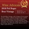 この2018年ヴィンテージで、ワインアドヴォケイト誌93+点獲得!コメントは『2018年のブリュット・ヴィンテージは、1リットルあたり7グラムのドサージュで、熟した果樹園の果実、パイナップル、桃、甘いスパイス、ペストリーのデリケートなブーケを示し、フルボディでリッチ、エレガントでクリーミーな中盤の味わいが続き、果実の肉厚な核へと移行し、突き抜けるような長く塩味のあるフィニッシュへと続く。ポル・ロジェのスタイルを愛する人にはたまらない。』と激賞!