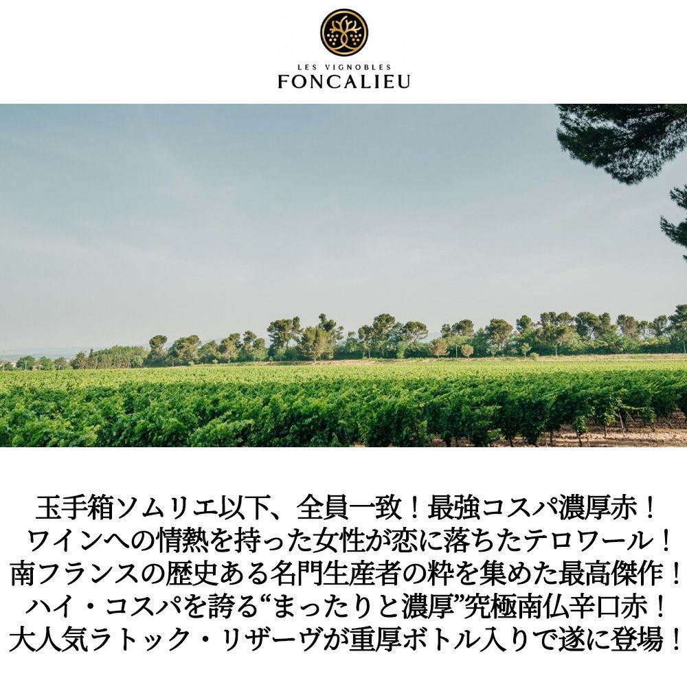 他の画像を見る ラトック リザーヴ 2021 レ ヴィニョーブル フォンカリユ 2018VTでサクラアワードダブルゴールドメダル受賞酒Latoque Reserve 2021 Les Vignoble Foncalieu IGP Pay d'oc 赤ワイン フランス フルボディ 辛口 当店特別価格 ¥ 1,452 税込 カートに入れる お気に入りに登録する