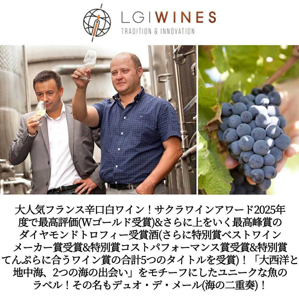 他の画像を見る デュオ デ メール (海の二重奏) ソーヴィニヨン ヴィオニエ 2024 LGI ワインズ社 VDF サクラワインアワード2025で最高峰賞Duo des Mers Sauvignon Viognier 2024 LGI LGI Wines 白ワイン フランス 辛口 当店特別価格 ¥ 1,107 税込 カートに入れる お気に入りに登録する