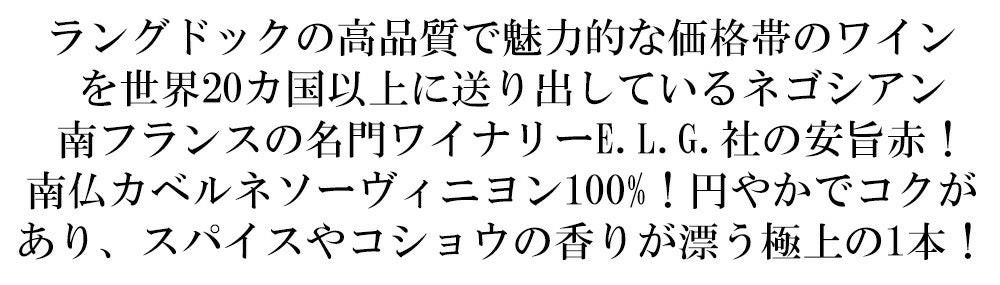 他の画像を見る コントル パロワ カベルネ ソーヴィニョン 2023 E.L.G.社 (南フランスの名門ワイナリーELG社) ラングドック IGPペイ ドックContre Parrois Cabernet Sauvignon 2022 E.L.G. 赤ワイン フランス ミディアムボディ 辛口 当店特別価格 ¥ 1,493 税込 在庫切れ 詳細を見る お気に入りに登録する