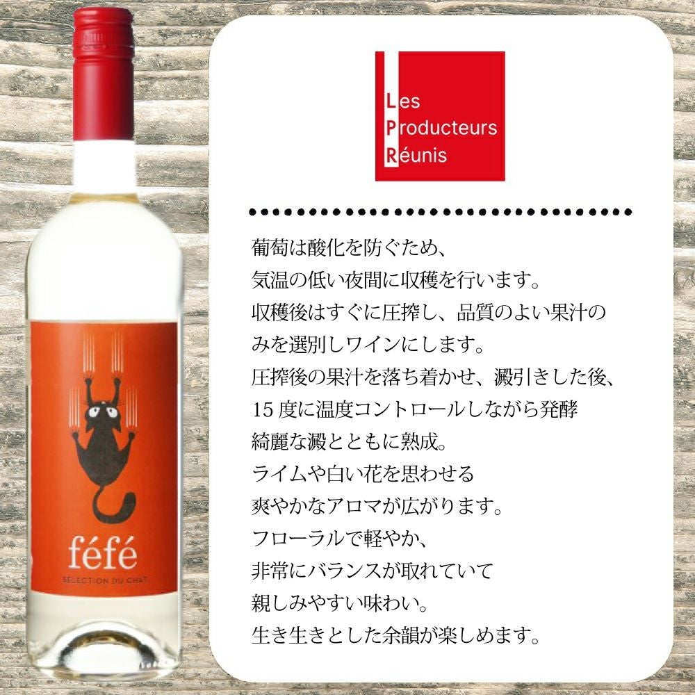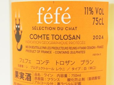 他の画像を見る フェフェ・コンテ・トロザン・ブラン[2024]年(フランス気質の猫ラベル)・レ・プロデュクトゥール・レウニ社Fefe Comte Tolosan Blanc 2023 白ワイン フランス 辛口 当店特別価格 ¥ 1,086 税込 カートに入れる お気に入りに登録する