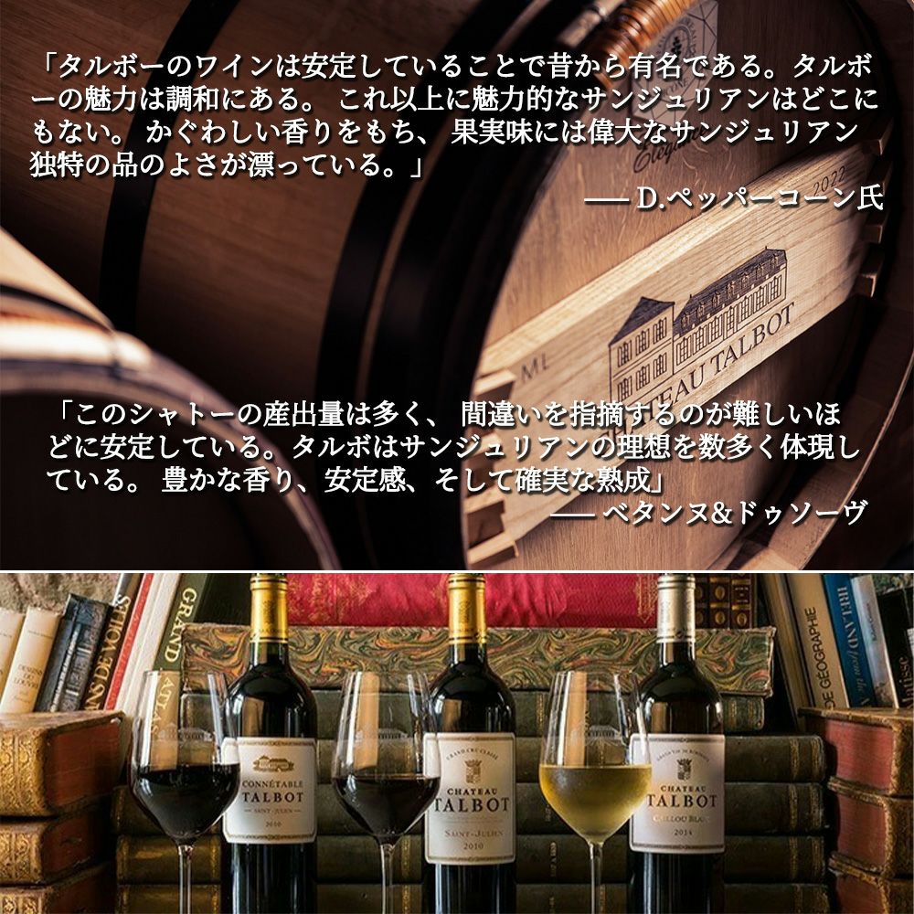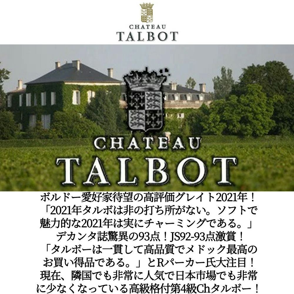 他の画像を見る シャトー タルボ 2021 AOCサンジュリアン メドック グラン クリュ クラッセ 格付第4級 デカンタ誌93点Chateau TALBOT [2021] AOC Saint-Julien 赤ワイン フランス フルボディ 辛口 当店特別価格 ¥ 9,384 税込 在庫切れ 詳細を見る お気に入りに登録する