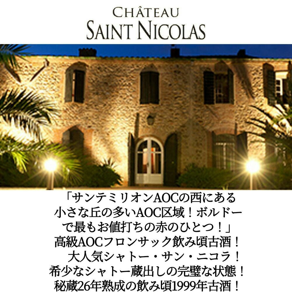 他の画像を見る シャトー サン ニコラ 1999 シャトー蔵出し AOCフロンサック 自然派サステナーブル農法 秘蔵26年熟成古酒Chateau Saint Nicolas 1999 AOC Fronsac 赤ワイン フルボディ 辛口 当店特別価格 ¥ 3,114 税込 在庫切れ 詳細を見る お気に入りに登録する
