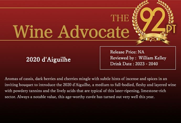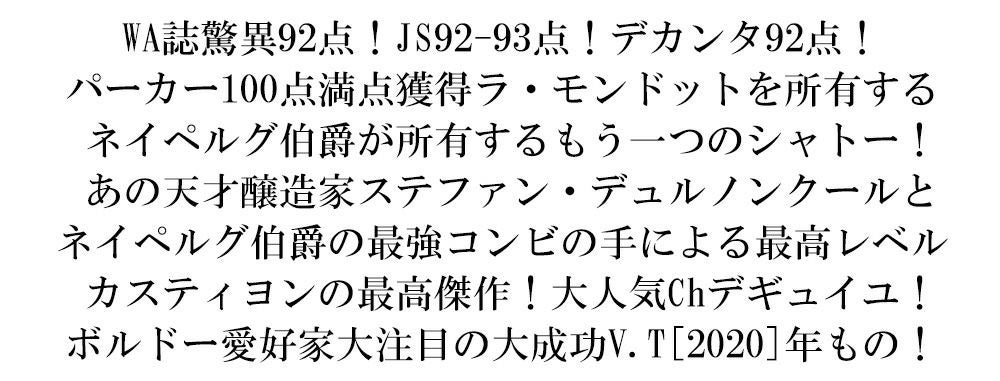 他の画像を見る シャトー デギュイユ デギーユ 2020 ネイペルグ伯爵&天才醸造家ステファン デュルノンクール AOCカスティヨン コート ド ボルドーChateau D'AIGUILHE [2020] AOC Castillon Cotes de 赤ワイン フランス フルボディ 辛口 当店特別価格 ¥ 3,741 税込 在庫切れ 詳細を見る お気に入りに登録する