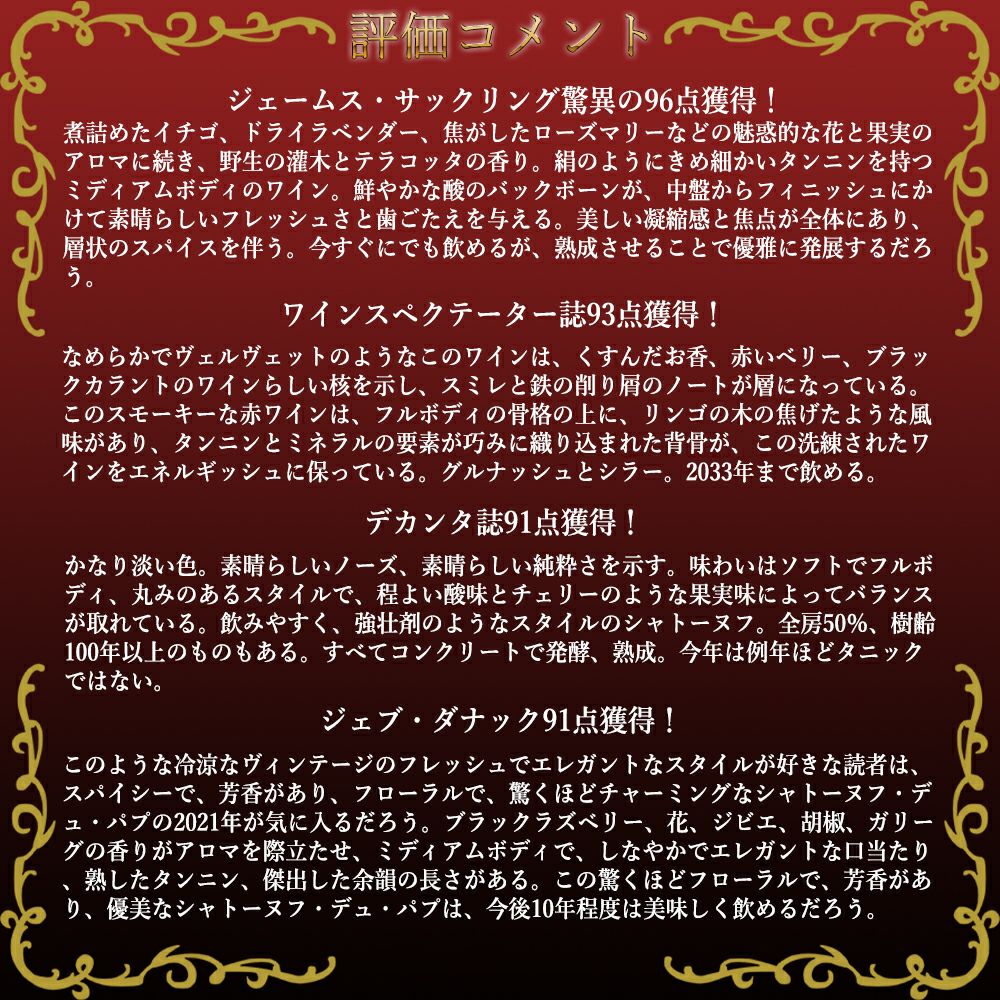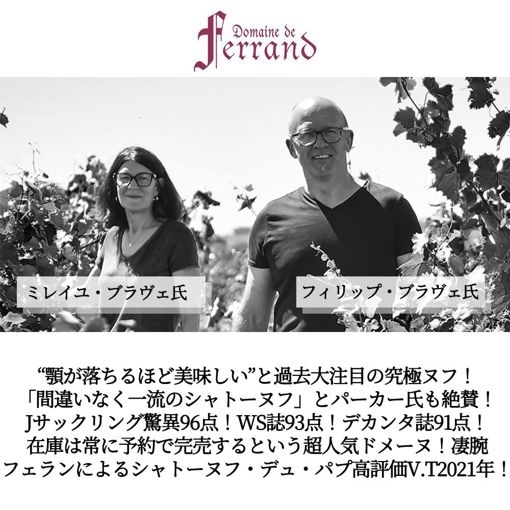 他の画像を見る シャトーヌフ デュ パプ 2021 ドメーヌ フェラン元詰 ロットナンバー入り レリーフボトル ノンフィルター 自然派 アルコール度数15% 赤 辛口Chateauneuf du Pape 2021 Domaine de Ferrand AOC 赤ワイン フランス フルボディ 辛口 自然派 当店特別価格 ¥ 5,935 税込 カートに入れる お気に入りに登録する