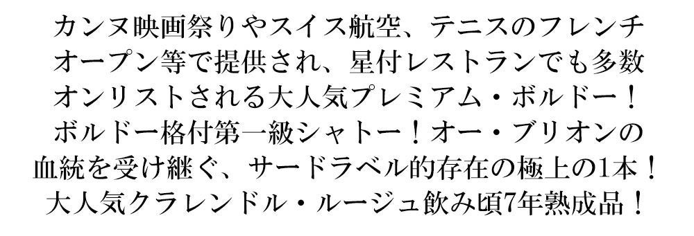 他の画像を見る クラレンドル ルージュ(バイ シャトー オー ブリオン) 2018 年 第97回アカデミー賞授賞式で唯一提供される赤白ワインとして、クラレンドル赤・白が振舞われました。 クラレンス ディロン家 AOCボルドー 赤ワイン フランス フルボディ 辛口 当店特別価格 ¥ 2,559 税込 カートに入れる お気に入りに登録する