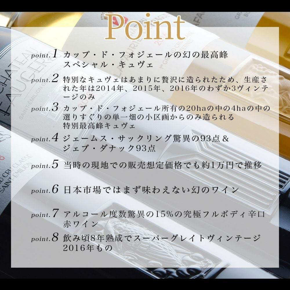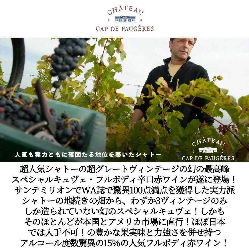 他の画像を見る 【3本以上ご購入で送料無料】シャトー カップ ド フォジェール ラ ムーレール 黒ラベル 2016 木樽発酵 オーク樽14ケ月熟成 度数驚異の15% 幻の最終キュヴェChateau Cap de Faugeres 'La Mouleyre' 2016 Chateau 赤ワイン フランス フルボディ 辛口 当店特別価格 ¥ 5,204 税込 カートに入れる お気に入りに登録する