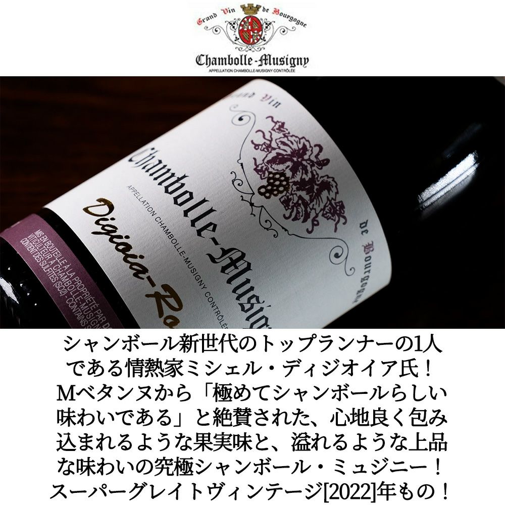 他の画像を見る シャンボール ミュジニー 2022 蔵出し限定品 ドメーヌ ディジオイア ロワイエ元詰 樹齢50年以上のVV&樽熟16-18ヶ月Chambolle Musigny 2022 Domaine Digioia-Royer 赤ワイン フランス フルボディ 辛口 当店特別価格 ¥ 16,385 税込 カートに入れる お気に入りに登録する