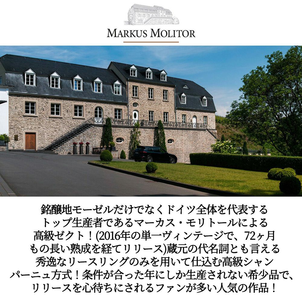 他の画像を見る マーカス モリトール リースリング ハウス クロスターベルク ブリュット ゼクト 高級シャンパーニュ方式 自然派 ビオ 辛口 11.5% 9年熟成Markus Molitor Haus Klosterberg Riesling Brut 白ワイン スパークリング ドイツ 辛口 自然派 当店特別価格 ¥ 3,982 税込 カートに入れる お気に入りに登録する