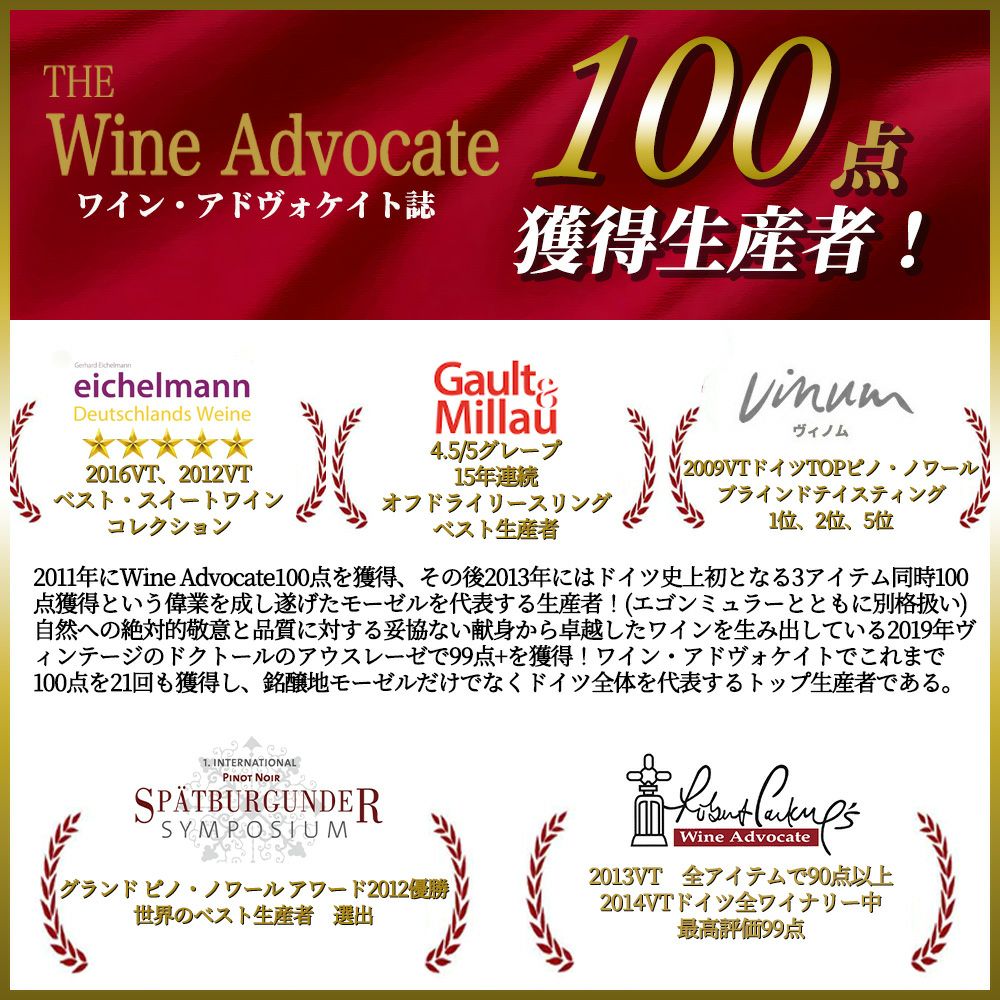 他の画像を見る 【ハーフサイズ】グラーハー ドムプロブスト リースリング アイスワイン (ゴールデン キャプセル) 2004 マーカス モリトール 8% 正規品Graacher Domprobst Riesling Eiswein Golden Kapsel 白ワイン ドイツ 極甘口 当店特別価格 ¥ 19,834 税込 カートに入れる お気に入りに登録する