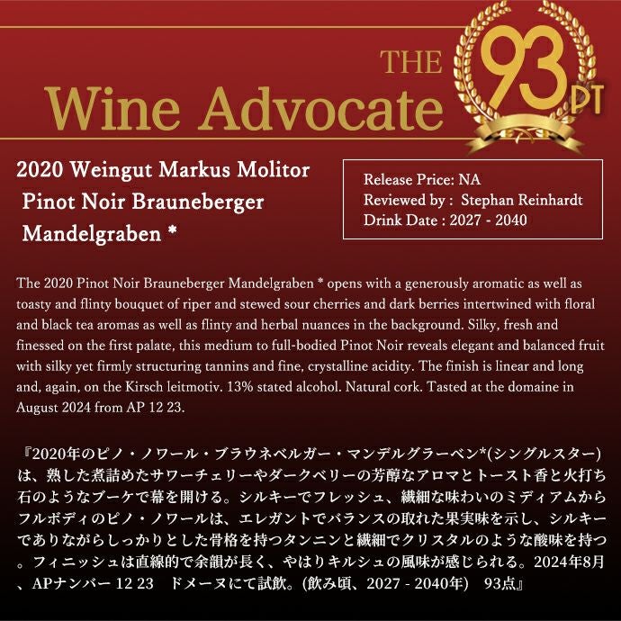 他の画像を見る マーカス モリトール ピノ ノワール ブラウネベルガー マンデルグラーベン トロッケン 2020 ワイングート マーカス モリトール元詰 自然派 辛口 赤 13% ワインアドヴォケイト誌驚異の93点(2027 - 2040)&ヴィノム誌90点 赤ワイン ドイツ 辛口 自然派 当店特別価格 ¥ 6,173 税込 在庫切れ 詳細を見る お気に入りに登録する