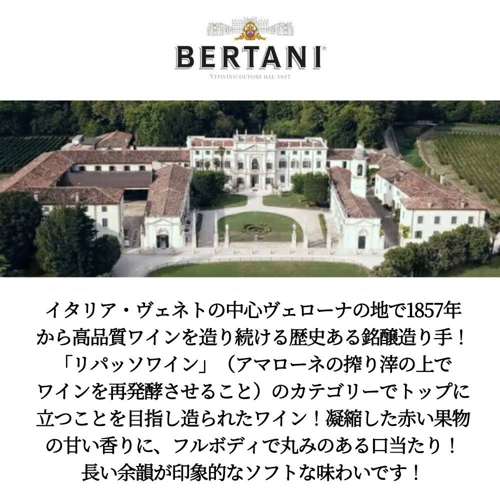 他の画像を見る ヴァルポリチェッラ リパッソ 2020 ベルターニValpolicella Ripasso Valpantena 2020 Bertani 赤ワイン イタリア フルボディ 辛口 当店特別価格 ¥ 3,483 税込 カートに入れる お気に入りに登録する