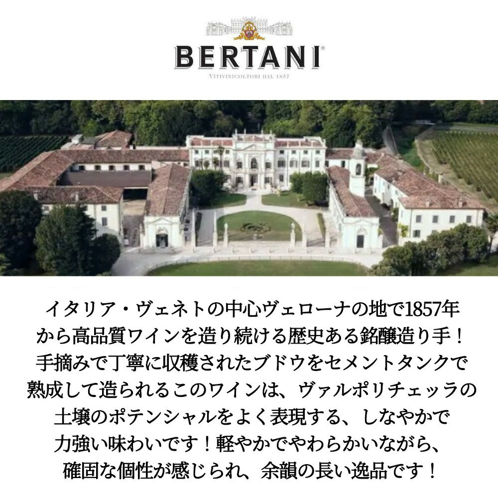 他の画像を見る ヴァルポリチェッラ 2023 ベルターニValpolicella 2023 Bertani 赤ワイン イタリア ミディアムボディ 辛口 当店特別価格 ¥ 1,686 税込 カートに入れる お気に入りに登録する