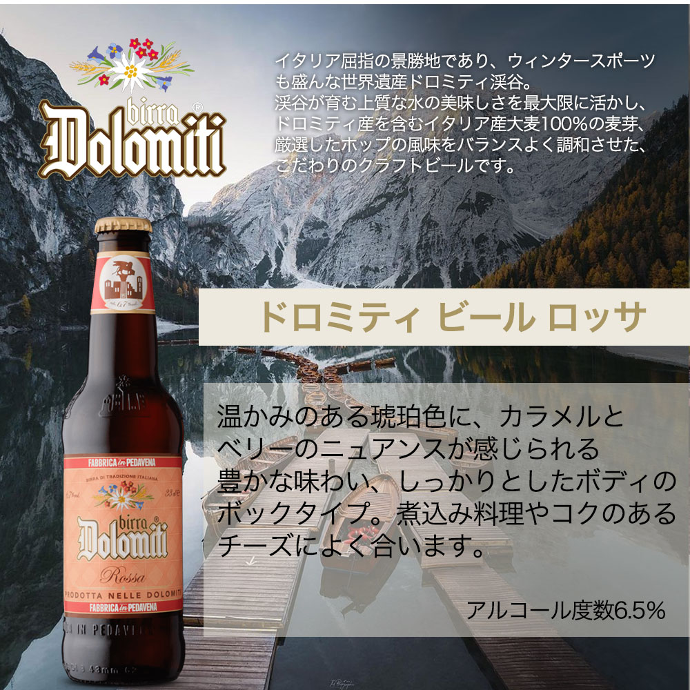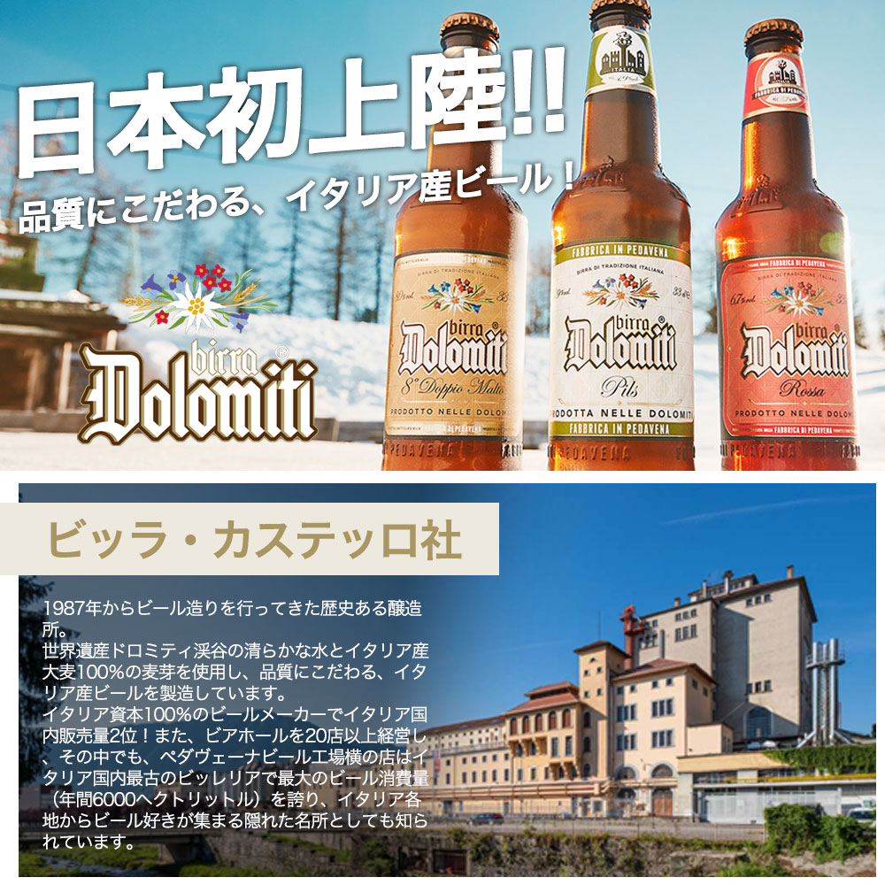 ビッラ・カステッロ社のドロミティはイタリア屈指の景勝地であり、ウィンタースポーツも盛んな世界遺産「ドロミティ渓谷」が育む上質な水の美味しさを最大限に活かし、ドロミティ産を含むイタリア産大麦100%の麦芽、厳選したホップの風味をバランスよく調和させた、こだわりのクラフトビール!