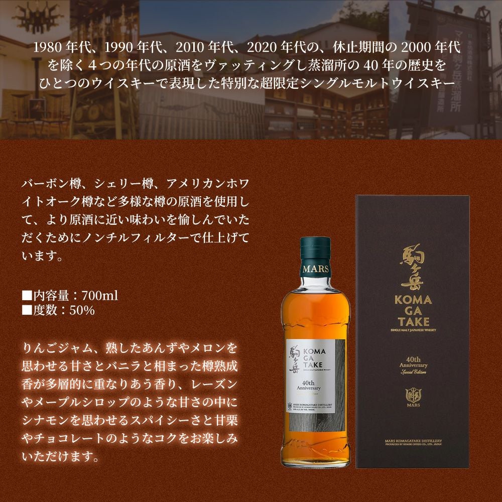 他の画像を見る 【正規品 箱入】シングルモルト 駒ヶ岳 40th Anniversary Special Edition 700ml 50%SINGLE MALT KOMAGATAKE 40th ANNIVERSARY SPECIAL EDITION ウイスキー 当店特別価格 ¥ 28,424 税込 在庫切れ 詳細を見る お気に入りに登録する