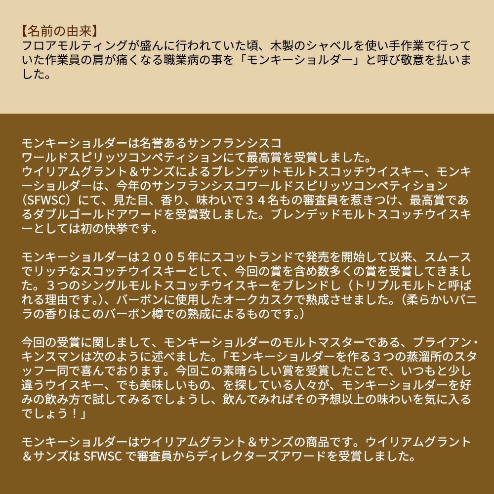 他の画像を見る 【正規品】モンキーショルダー スモーキーモンキー ブレンデッド モルト・スコッチ ウイスキー ウィリアム グラント社 700ml 40%MONKEY SHOULDER SMOKEY MONKEY BLENDED MALT SCOTCH ウイスキー 当店特別価格 ¥ 5,088 税込 カートに入れる お気に入りに登録する