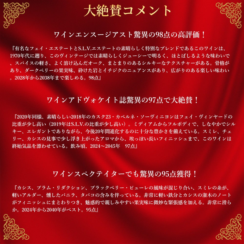 他の画像を見る カスク (CASK) 23 スタッグスリープ ワイン セラーズ 2006 蔵出し品 驚異の24ヶ月熟成 正規品 20年熟成作品 赤 辛口 フルボディStag's Leap Wine Cellars Estate 'Cask 23' 2006 赤ワイン アメリカ フルボディ 辛口 当店特別価格 ¥ 63,201 税込 カートに入れる お気に入りに登録する