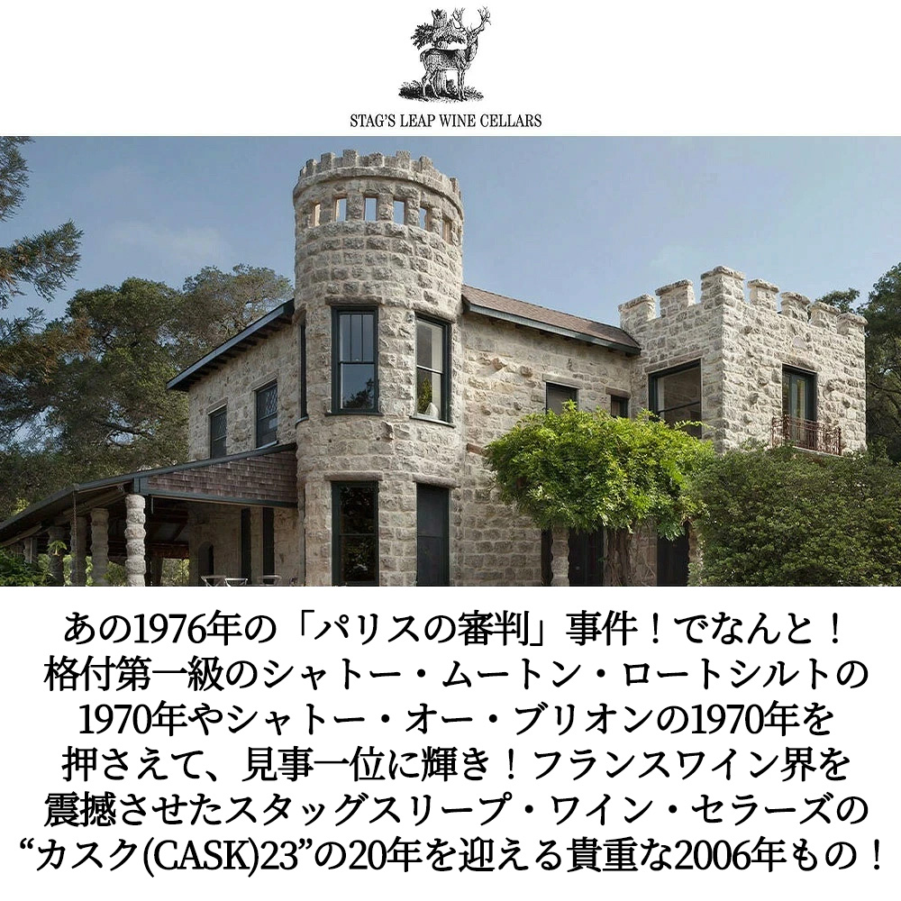 “カスク(CASK)23”・スタッグスリープ・ワイン・セラーズ[2006]年・蔵出し品・自社畑100%のカベルネ・ソーヴィニョン100%をフレンチオーク樽100%で驚異の24ヶ月熟成(新樽58%)・(ワインメーカー・ニッキ・プリュス)・WE91点&CT94点&コノサーズ・ガイド誌92点&ジャンシス・ロビンソン17.5/20点・カリフォルニア・ナパヴァレー・スタッグスリープ・ディストリクト・正規品・20年熟成作品