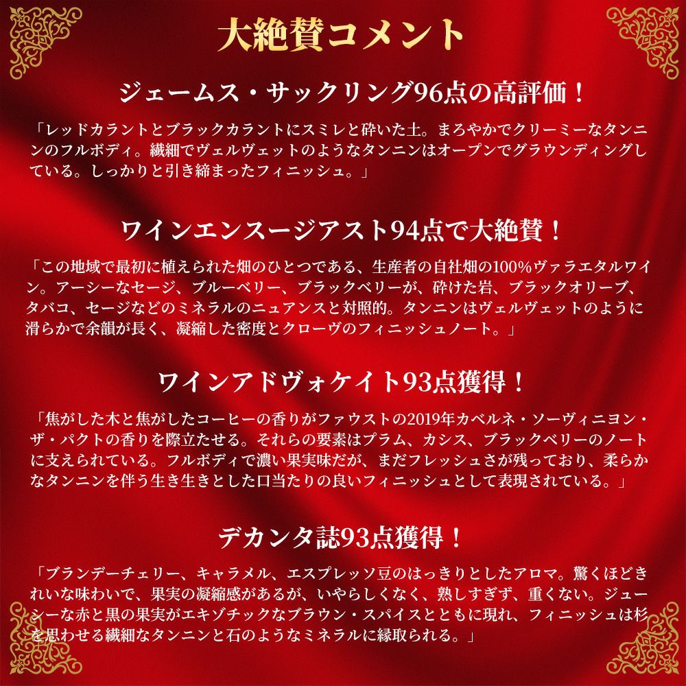 他の画像を見る ザ パクト ファウスト ナパ ヴァレー 2019 ファウスト(クィンテッサ) カベルネ ソーヴィニヨン100% ジェームス サックリング驚異の96点THE PACT Faust Napa Valley 2019 AVA Coombsville 赤ワイン アメリカ フルボディ 辛口 当店特別価格 ¥ 18,371 税込 カートに入れる お気に入りに登録する