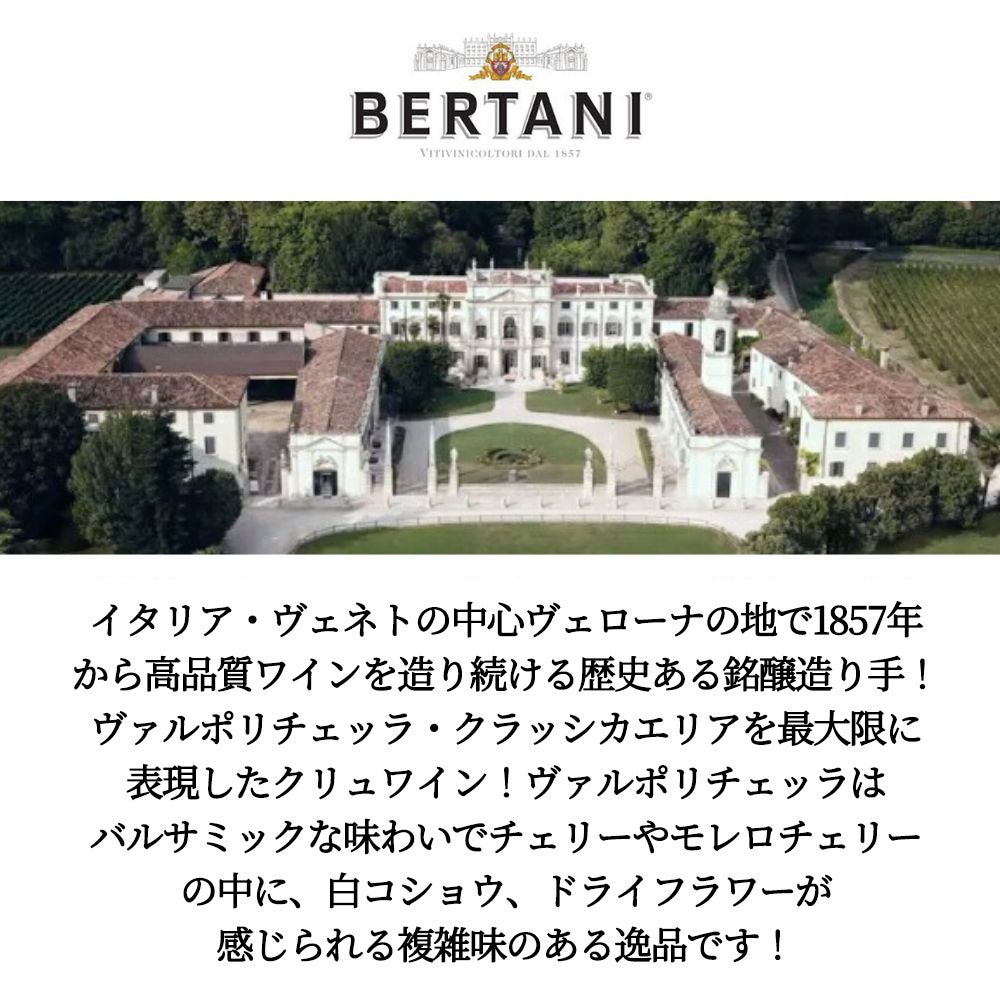 他の画像を見る ヴァルポリチェッラ 2024 ベルターニValpolicella 2024 Bertani 赤ワイン イタリア ミディアムボディ 辛口 当店特別価格 ¥ 1,686 税込 カートに入れる お気に入りに登録する