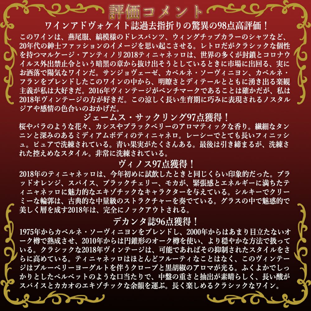 他の画像を見る ティニャネロ 2016 テヌータ ティニャネロ(アンティノリ)元詰 IGTトスカーナ アントニオ ガッローニ驚異の98点 正規代理店輸入品Tignanello 2016 Tenuta Tignanello (Antinori) 赤ワイン イタリア フルボディ 辛口 当店特別価格 ¥ 26,104 税込 在庫切れ 詳細を見る お気に入りに登録する