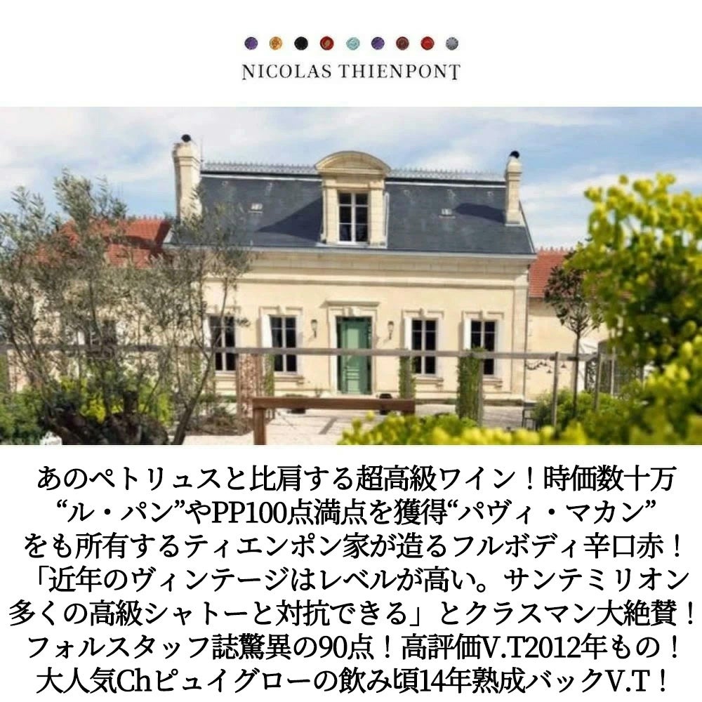 他の画像を見る シャトー ピュイゲロー (ピュイグロー) 2012 飲み頃14年熟成バックヴィンテージ ニコラ ティエンポン家元詰 赤 フルボディ 辛口 750mlChateau Puygueraud 2012 AOC Francs Cotes de 赤ワイン フランス フルボディ 辛口 当店特別価格 ¥ 2,967 税込 在庫切れ 詳細を見る お気に入りに登録する