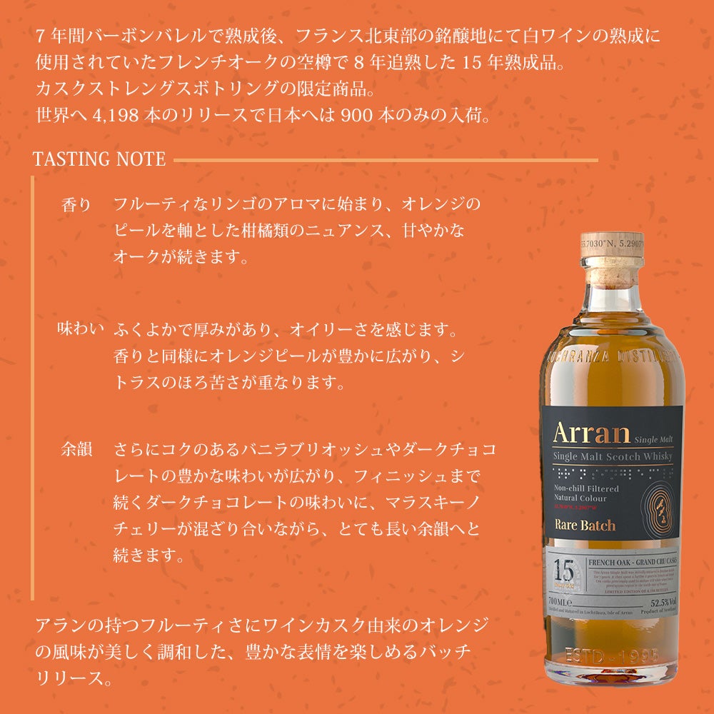 他の画像を見る 【正規品 箱入】アラン レアバッチ 15年 フレンチオーク グラン クリュ カスク シングル モルト スコッチ ウイスキー 700ml 52.5%ARRAN RARE BATCH AGED 15 YEARS FRENCH AOK GRAND CRU CASK ウイスキー 当店特別価格 ¥ 26,469 税込 カートに入れる お気に入りに登録する
