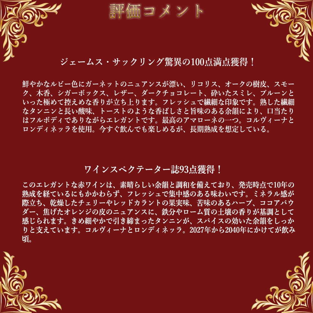 他の画像を見る アマローネ デッラ ヴァルポリチェッラ クラッシコ 2015 蔵出し品 ベルターニ社元詰 DOCG 正規品 JS驚異の100点満点!BERTANI Amarone della Valpolicella Classico 2015 赤ワイン イタリア フルボディ 辛口 当店特別価格 ¥ 17,744 税込 カートに入れる お気に入りに登録する
