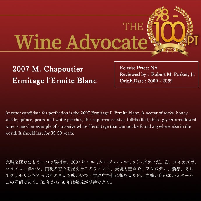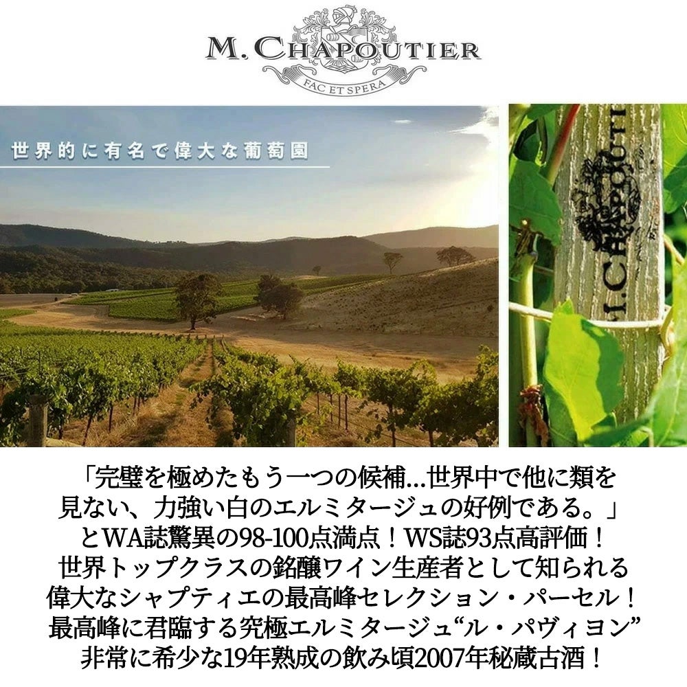 他の画像を見る エルミタージュ レルミット ブラン 2007 蔵出し限定品 M シャプティエ(セレクション パーセル) ワインアドヴォケイト誌98-100点満点 自然派ERMITAGE L'ERMITE Blanc 2007 M Chapoutier 白ワイン フランス 辛口 自然派 当店特別価格 ¥ 55,176 税込 カートに入れる お気に入りに登録する