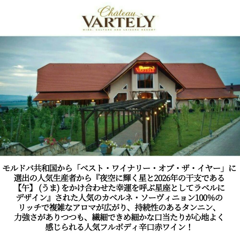他の画像を見る カベルネ ソーヴィニヨン コンステレーション ホース (星座の馬) リミテッド エディション 2023 シャトー ヴァルテリー 干支 馬 午 ラベルCabernet Sauvignon Constelation Horse Limited Edition 2023 Chateau Vartely 赤ワイン フルボディ 辛口 当店特別価格 ¥ 1,254 税込 カートに入れる お気に入りに登録する