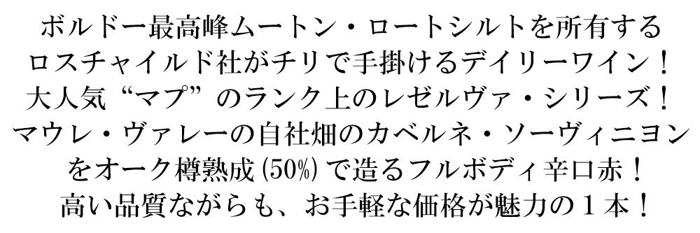 他の画像を見る マプ レゼルヴァ カベルネ ソーヴィニヨン 2022 バロン フィリップ ド ロスチャイルド マイポ チリMapu Reserva Cabernet Sauvignon 2022 Baron Philippe de Rothschild 赤ワイン チリ フルボディ 辛口 当店特別価格 ¥ 1,661 税込 カートに入れる お気に入りに登録する