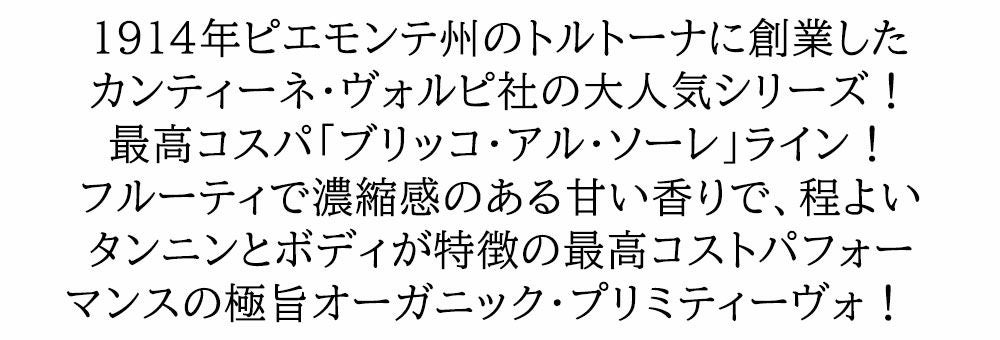 他の画像を見る ブリッコ アル ソーレ プリミティーヴォ オーガニック 2024 カンティーネ ヴォルピ社 IGTプーリア オーガニックワインBricco al Sole Primitivo 2024 Cantine Volpi IGT Puglia 赤ワイン イタリア ミディアムボディ 辛口 当店特別価格 ¥ 1,233 税込 カートに入れる お気に入りに登録する