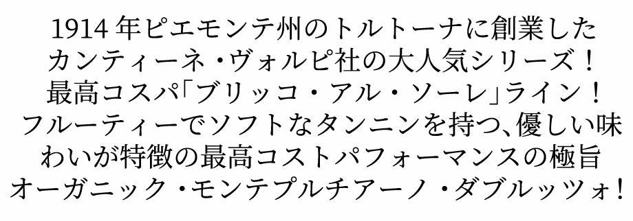 他の画像を見る ブリッコ アル ソーレ モンテプルチアーノ ダブルッツォ オーガニック 2022 カンティーネ ヴォルピ社 オーガニックワイン 赤Bricco al Sole Montepulciano d'Abruzzo 2022 Cantine Volpi 赤ワイン イタリア ミディアムボディ 辛口 当店特別価格 ¥ 1,233 税込 カートに入れる お気に入りに登録する