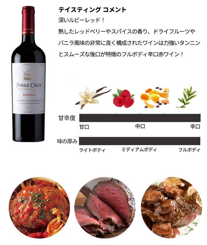 他の画像を見る ぺレス クルス カベルネ ソーヴィニヨン レセルバ 2022 750ml 正規 チリ 赤ワインPEREZ CRUZ Cabernet Sauvignon Reserva 2022 Family Vineyards 100% Estate Bottled D.O Valle del Maipo Andes 赤ワイン チリ フルボディ 辛口 当店特別価格 ¥ 1,672 税込 カートに入れる お気に入りに登録する
