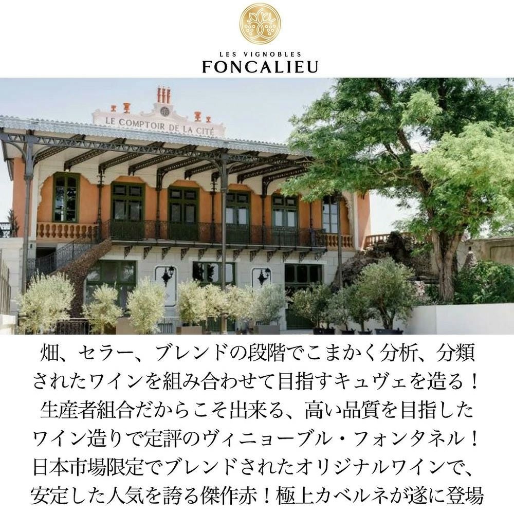 他の画像を見る レ ヴィニョーブル フォンタネル ペイ ドック カベルネ ソーヴィニヨン 2023 トロワ エトワール フォンカリュ社Les Vignobles Foncalieu les Pays d'Oc Cabernet Sauvignon 赤ワイン フランス ミディアムボディ 辛口 当店特別価格 ¥ 1,170 税込 カートに入れる お気に入りに登録する