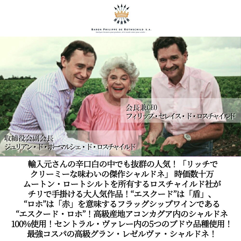 他の画像を見る エスクード ロホ グラン レゼルヴァ シャルドネ 2023 バロン フィリップ ド ロスチャイルド マイポ チリEscudo Rojo Reserva Chardonnay 2023 Baron Philippe de Rothschild 白ワイン チリ 辛口 当店特別価格 ¥ 1,870 税込 カートに入れる お気に入りに登録する
