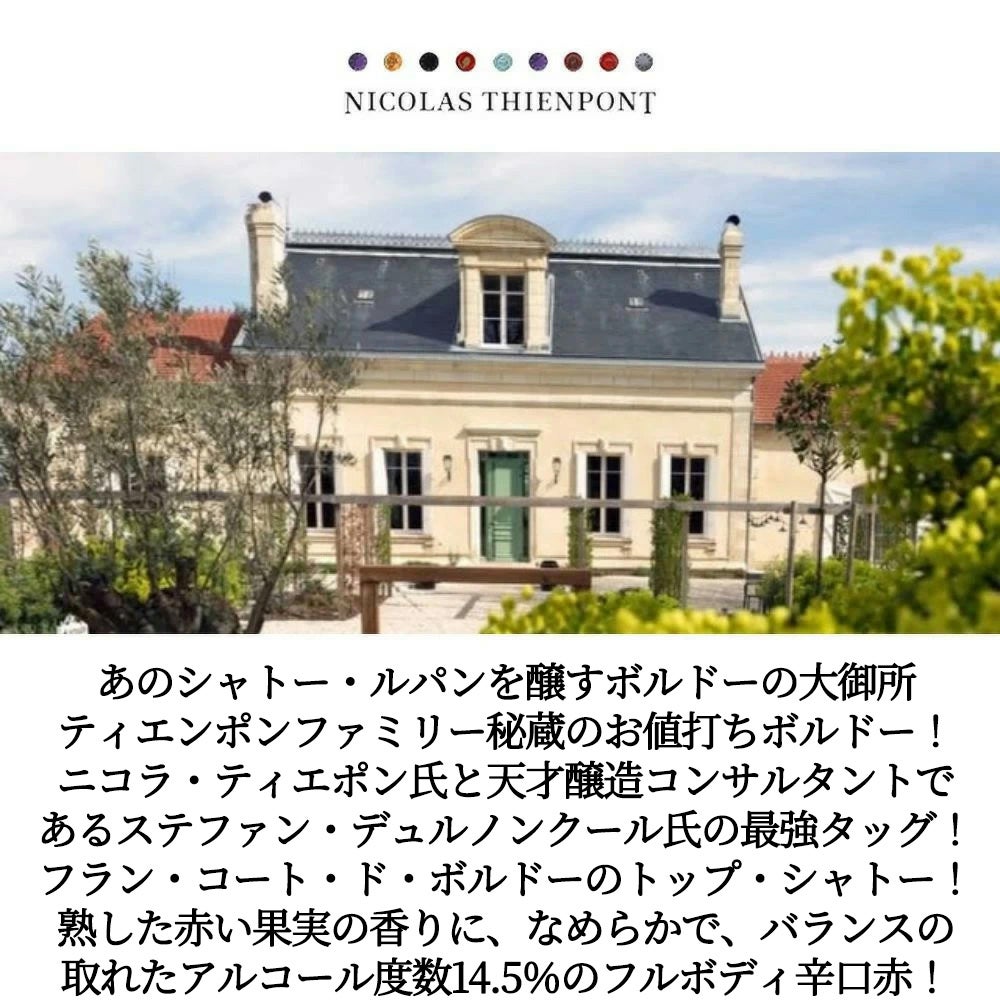 他の画像を見る シャトー ラクラヴリ 2023 ニコラ ティエンポン家元詰 AOCフラン コート ド ボルドー メルロー100% アルコール度数14.5%Chateau Laclaverie 2023 AOC Francs Cotes de Bordeaux 赤ワイン フランス フルボディ 辛口 当店特別価格 ¥ 3,019 税込 カートに入れる お気に入りに登録する