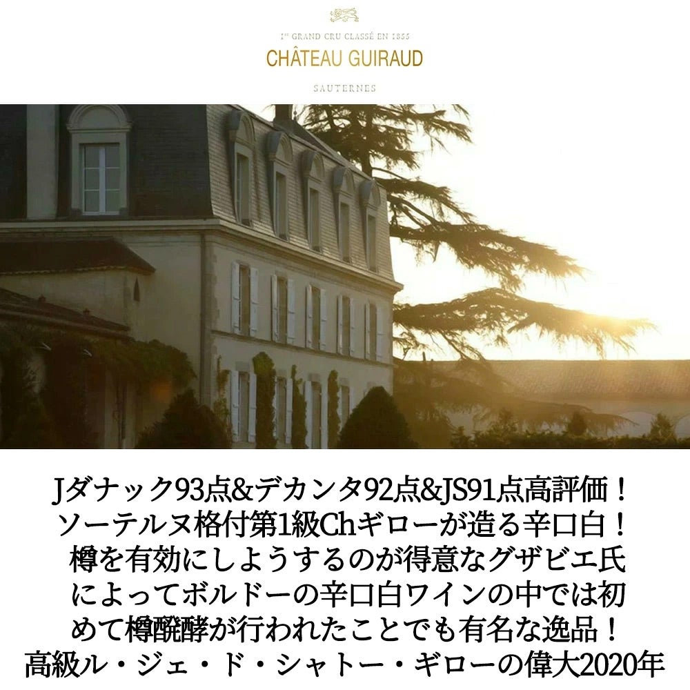 他の画像を見る ル ジェ ド シャトー ギロー 2020 年 オーク樽7ヶ月熟成 ソーテルヌ格付 シャトー ギローの辛口 AOCボルドー セック 自然派ビオロジック Le G de CHATEAU GUIRAUD 2020 AOC Bordeaux Blanc sec 白ワイン フランス 辛口 当店特別価格 ¥ 2,350 税込 カートに入れる お気に入りに登録する