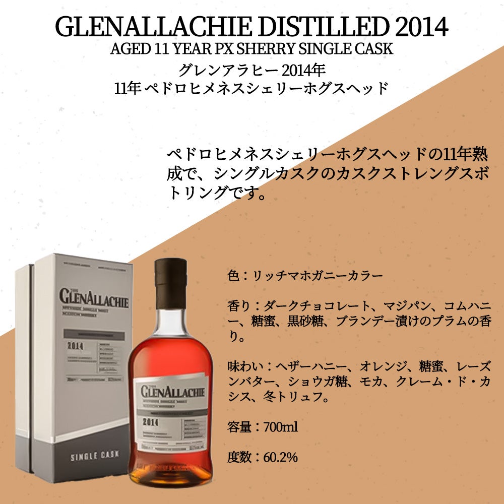 他の画像を見る 【正規品 箱入】グレンアラヒー 2014 年 11 年 ペドロヒメネスシェリーホグスヘッド シングルカスク カスクストレングス スペイサイド シングルGLENALLACHIE DISTILLED 2014 AGED 11 YEAR PX ウイスキー 当店特別価格 ¥ 19,154 税込 カートに入れる お気に入りに登録する