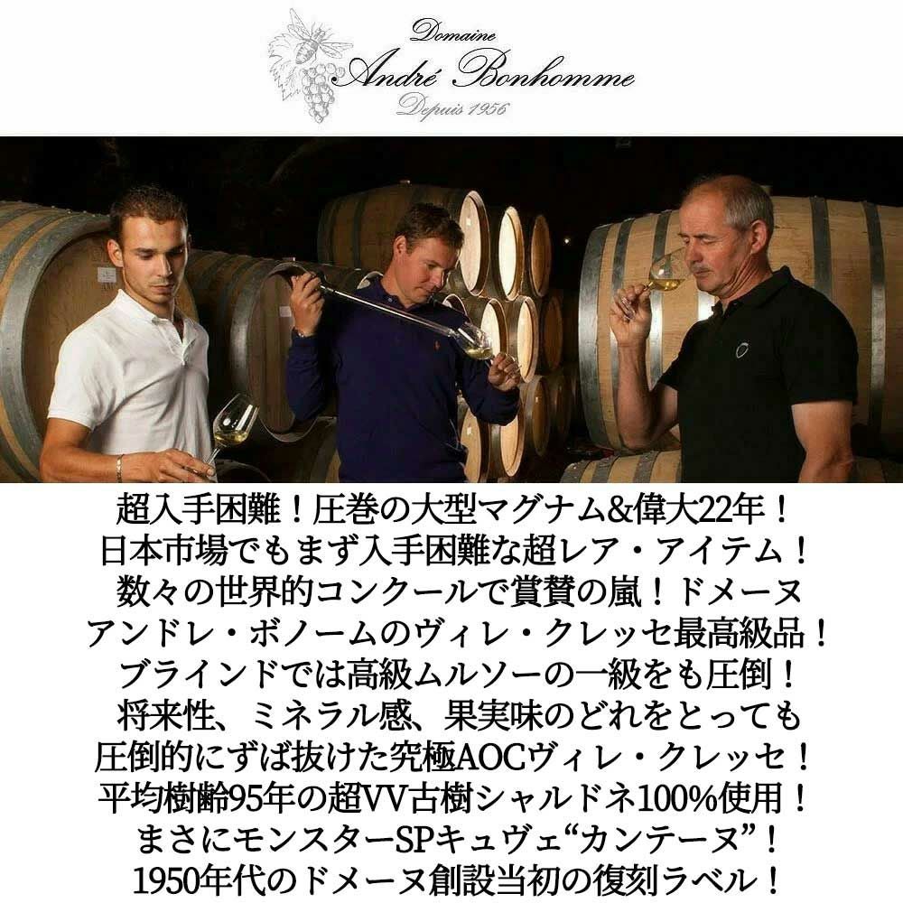 他の画像を見る 【大型ボトル】ヴィレ クレッセ レ プレトル ド カンテーヌ 2022 蔵出し限定生産品 ドメーヌ アンドレ ボノム元詰 Vire Clesse Les Pretres de Quintaine 2022 Domaine Andre Bonhomme MG Size 白ワイン フランス 辛口 当店特別価格 ¥ 16,720 税込 カートに入れる お気に入りに登録する