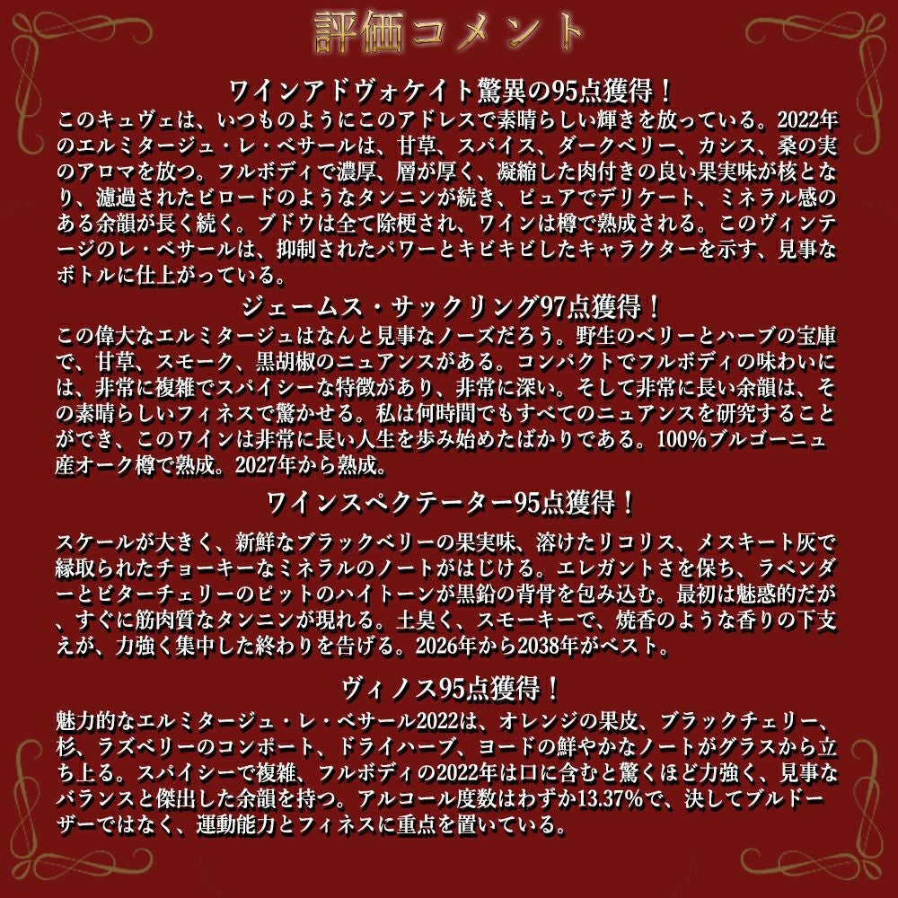 他の画像を見る エルミタージュ レ ベサール 2022 ドゥラス社 AOCエルミタージュ 正規品 WA驚異の95点&WS95点&JS97点&ヴィノス95点Hermitage Les Bessards 2022 Delas AOC Hermitage 赤ワイン フランス フルボディ 辛口 当店特別価格 ¥ 30,284 税込 カートに入れる お気に入りに登録する