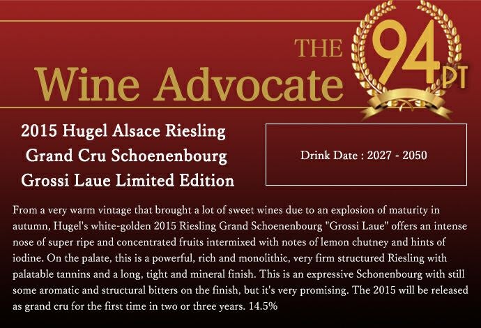 他の画像を見る ヒューゲル アルザス グラン クリュ 特級 シュナンブール グロシ ローイ 2015 蔵出し限定作品 ヒューゲル家Hugel Alsace Riesling Grand Cru Schoenenbourg Grossi Laue Limited 白ワイン フランス やや辛口 当店特別価格 ¥ 11,380 税込 カートに入れる お気に入りに登録する