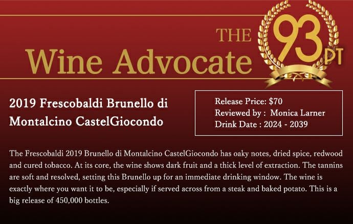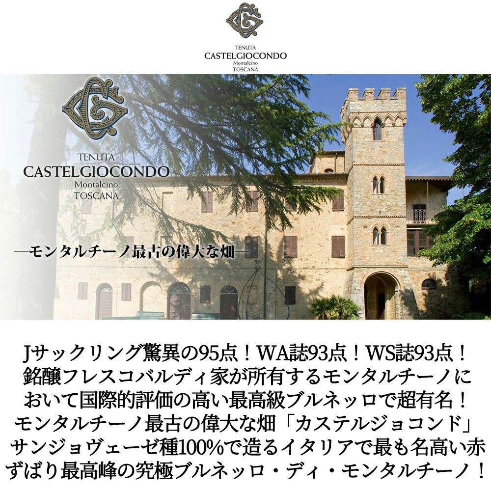 他の画像を見る ブルネッロ ディ モンタルチーノ カステルジョコンド 2019 蔵出し品 テヌータ カステルジョコンド エステート フレスコバルディ社元詰 正規品Brunello di Montalcino Castelgiocondo [2019] 赤ワイン イタリア フルボディ 辛口 当店特別価格 ¥ 11,578 税込 カートに入れる お気に入りに登録する