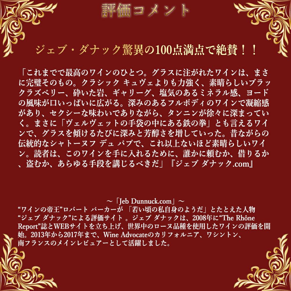 他の画像を見る シャトーヌフ デュ パプ ルージュ ラ キュヴェ デュ パペ 2016 蔵出し限定作品 Dm クロ デュ モン オリヴェ JD100点満点獲得Chateauneuf du Pape La Cuvee Papet 2016 Domaine 赤ワイン フランス フルボディ 辛口 当店特別価格 ¥ 23,645 税込 カートに入れる お気に入りに登録する