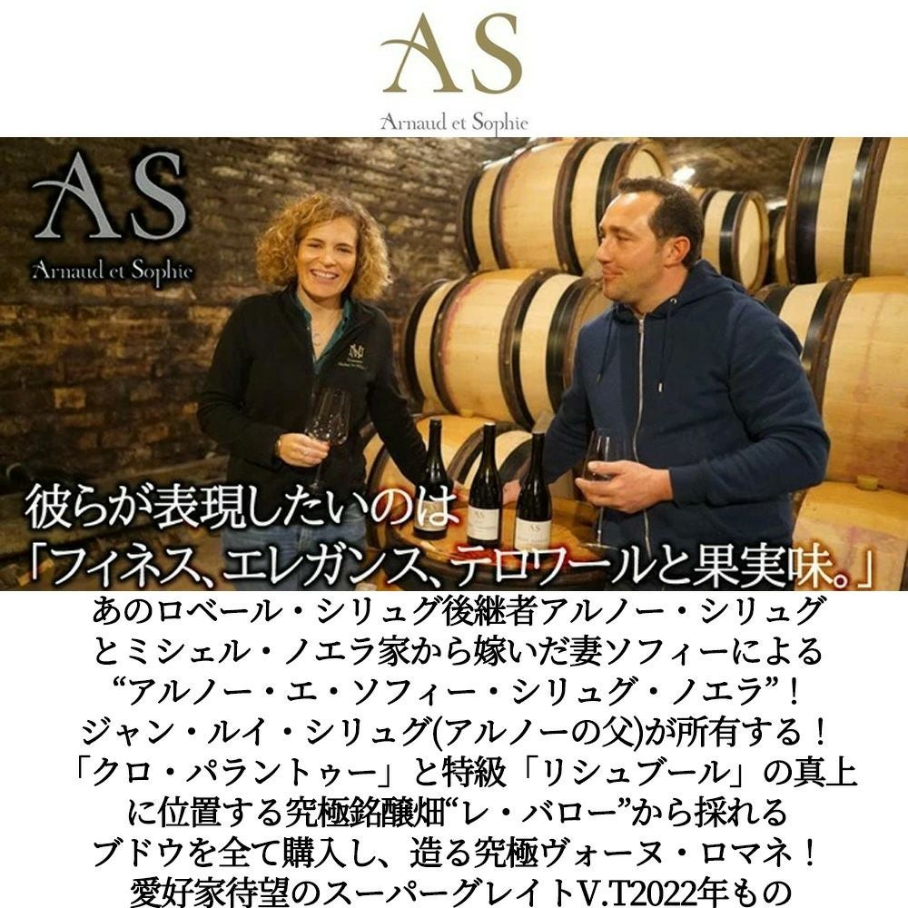 他の画像を見る ヴォーヌ ロマネ レ バロー 2022 アルノー エ ソフィ シリュグ ノエラ元詰 蔵出し限定品 正規代理店輸入品 AOCヴォーヌ ロマネ 赤 辛口Vosne Romanee Les Barreaux [2022] Arnaud ET 赤ワイン フランス フルボディ 辛口 当店特別価格 ¥ 24,244 税込 カートに入れる お気に入りに登録する