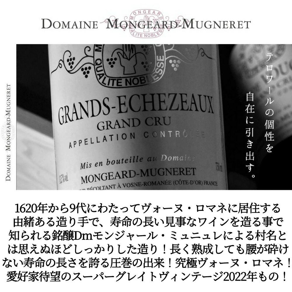 他の画像を見る ヴォーヌ ロマネ 2022 ドメーヌ モンジャール ミュニュレ元詰 蔵出し品 AOCヴォーヌ ロマネVosne Romanee [2022] Domaine Mongeard-Mugneret AOC Vosne Romanee 赤ワイン フランス フルボディ 辛口 当店特別価格 ¥ 17,556 税込 カートに入れる お気に入りに登録する