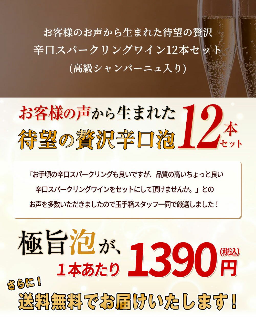 他の画像を見る 【送料無料】お客様のお声から生まれた待望の贅沢辛口スパークリングワイン12本セット (高級シャンパーニュ入り) ワインセット スパークリング シャンパン ワインセット 当店特別価格 ¥ 15,845 税込 カートに入れる お気に入りに登録する