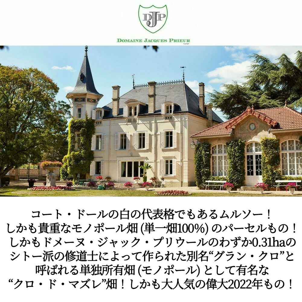 他の画像を見る ムルソー クロ ド マズレー (モノポール畑) ブラン 2022 ドメーヌ ジャック プリウール元詰Meursault Clos de Mazeray (Monopole) Blanc 2022 Domaine Jacques Prieur 白ワイン フランス 辛口 当店特別価格 ¥ 15,104 税込 カートに入れる お気に入りに登録する